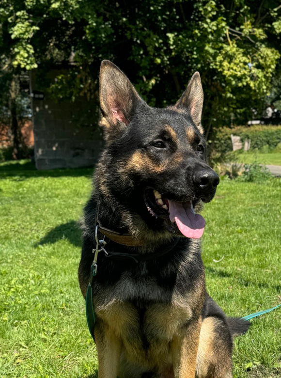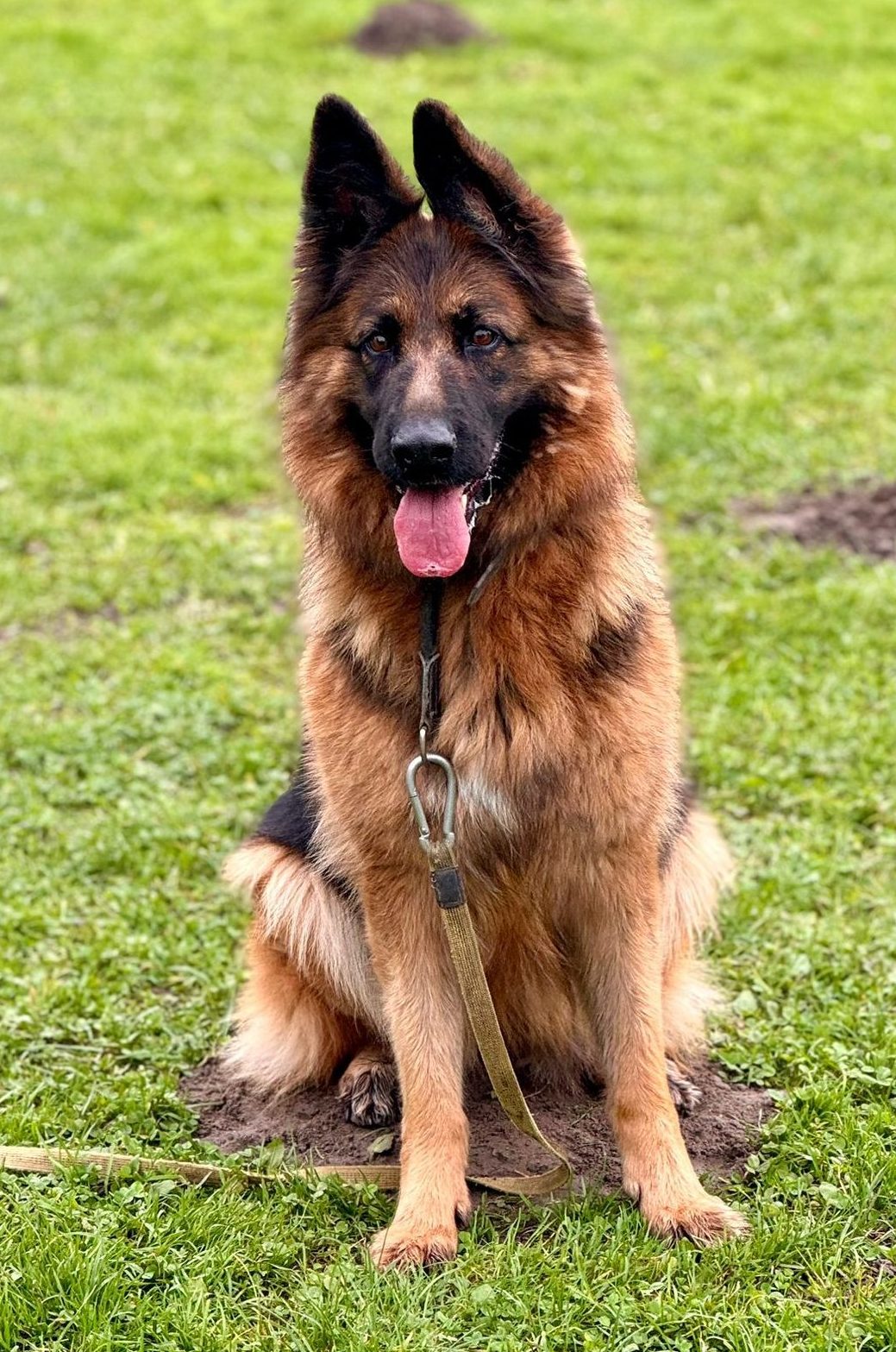 Sam (ehemals Bruno) ist ein beeindruckender, vierjähriger Deutscher Schäferhund mit einem Gewicht von etwa 40 Kilogramm.